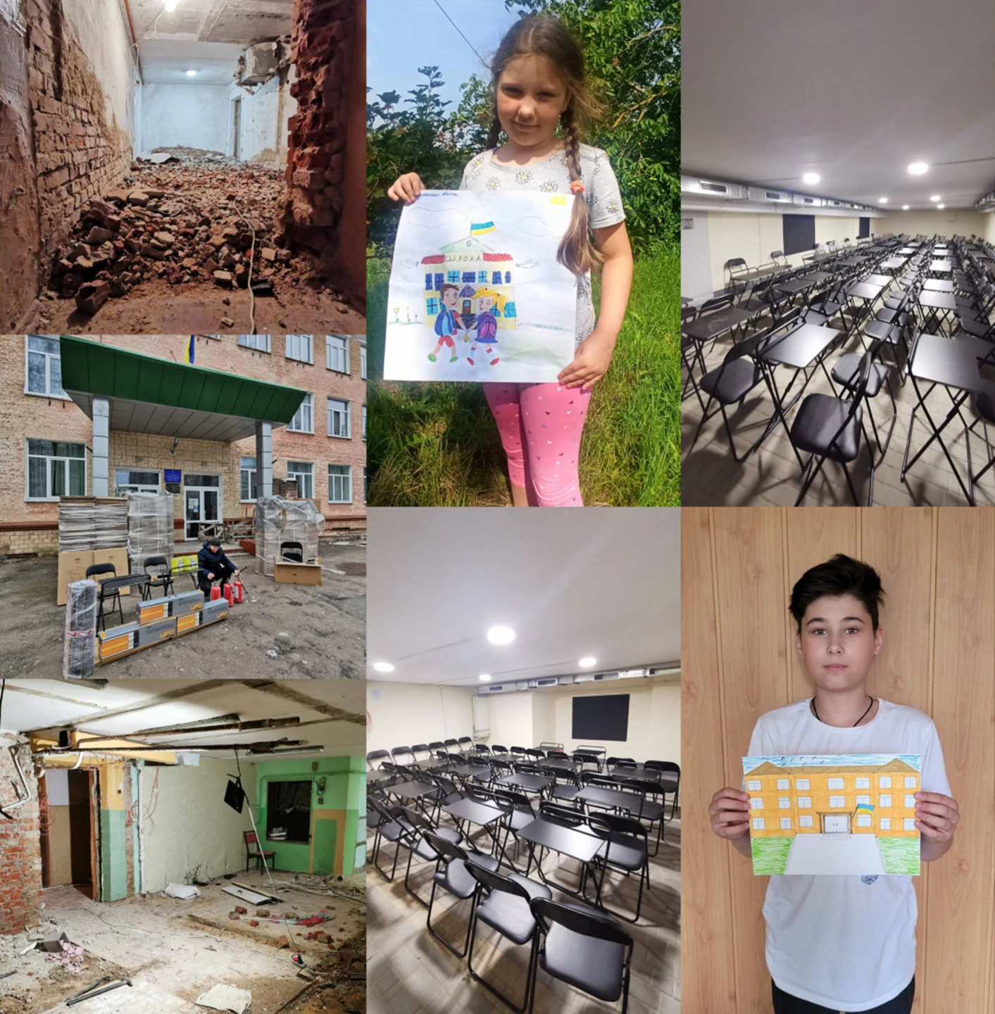 Chernihiv school that was seriously damaged in March 2022 by a rocket that hit the schoolyard. The building was not destroyed, but the blast knocked out 88 school windows and damaged 36 radiators, and a huge amount of shrapnel damage remained on the building’s facade.